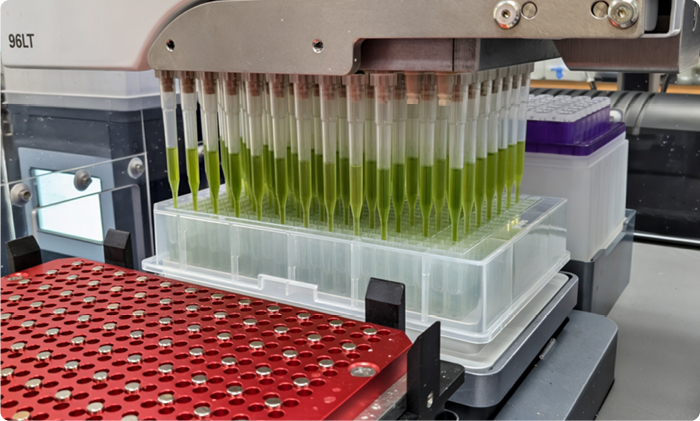 To further increase efficiency and consistency, the Smart Lab has automated key steps of the PACE genotyping workflow using an Agilent Bravo liquid- handling robot. The system performs both DNA extraction and PACE assay setup in 96- or 384-well plate formats. This automation enables high- throughput screening of over 3,000 samples per week—from seedling tissue collection to genotype calls—with minimal manual bench time. This expanded throughput enables the selection and scale-up of low-frequency alleles that would otherwise be too rare to capture and advance in breeding populations.